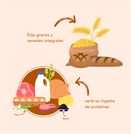 Incorpore cereales integrales en su dieta diaria y limite la ingesta de cereales refinados. Intente que al menos la mitad de todos los cereales que consuma sean 100% integrales.